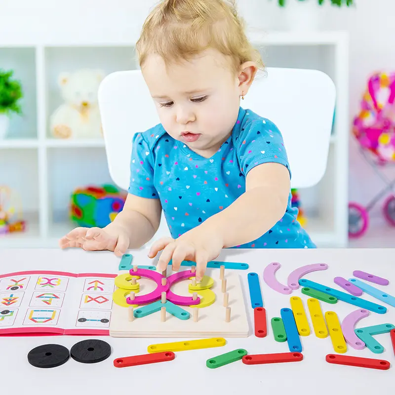 - قطع خشبية ملونة: بألوان زاهية تجذب انتباه الأطفال وتحفز حواسهم.