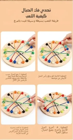 امنح أطفالك متعة التعلم والتحدي مع لعبة فك الحبال الممتعة! اللوح الخشبي الملون المليء بالعُقَد وحبال السيليكون يمنح الصغار تجربة ترفيهية وتعليمية بعيداً عن الشاشات 🎨.